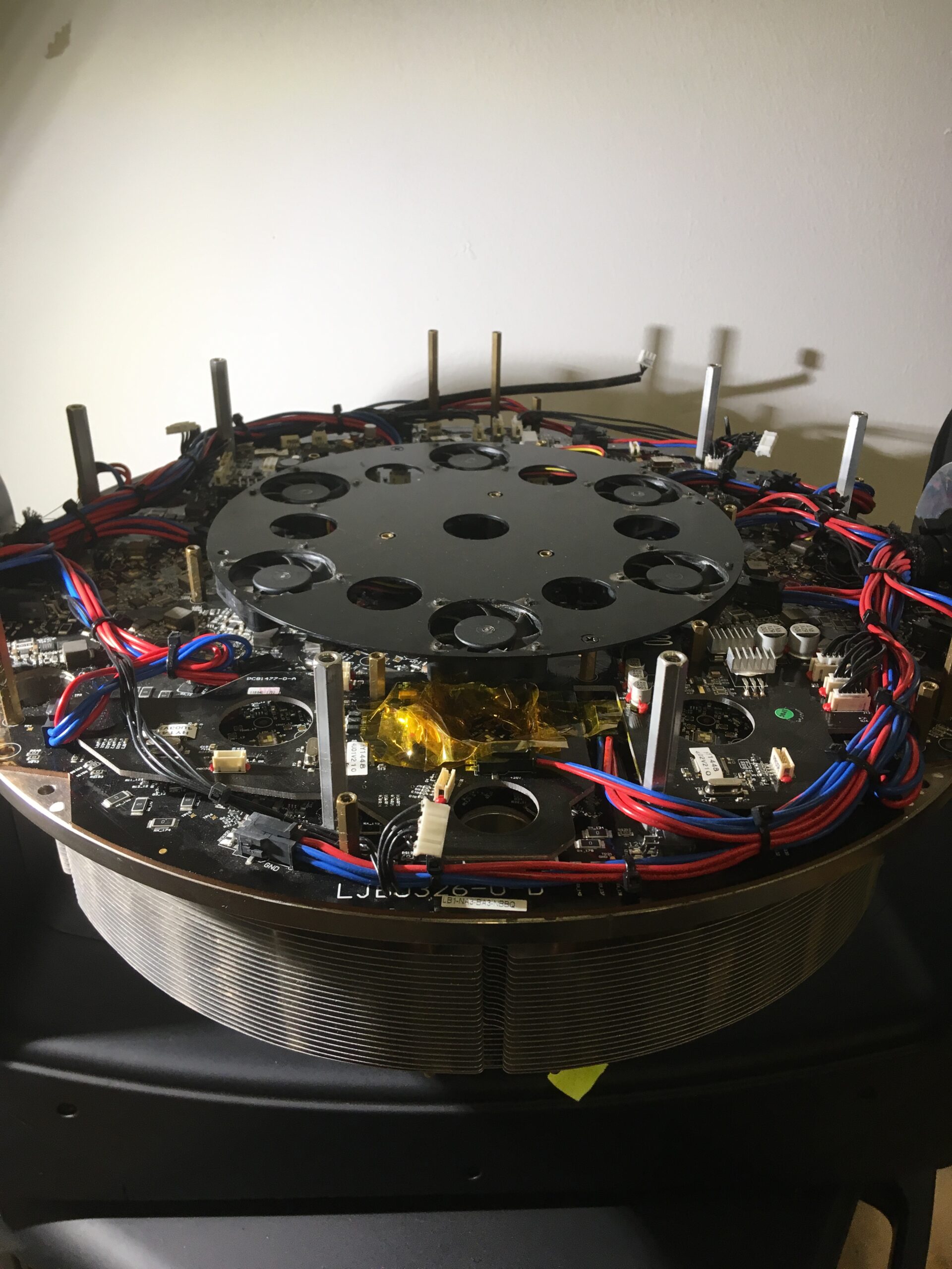 A képen egy 1200W-os wash robotlámpa „feje” látható, burkolat és optikai elemek nélkül. A lámpa azzal a hibával került hozzám hogy egy pár LED nem világított bizonyos színeken. Mint kiderült, a meghibásodott LED-eket cserélni kellett. Sajnos ennek cseréje nem egy egyszerű feladat, mert a felületszerelt alkatrészek egy réz lemezen elhelyezett panelra vannak forrasztva ami azonnal elvezeti a hőt, ezáltal az alkatrészek forrasztása csak speciális eszközökkel lehetséges.